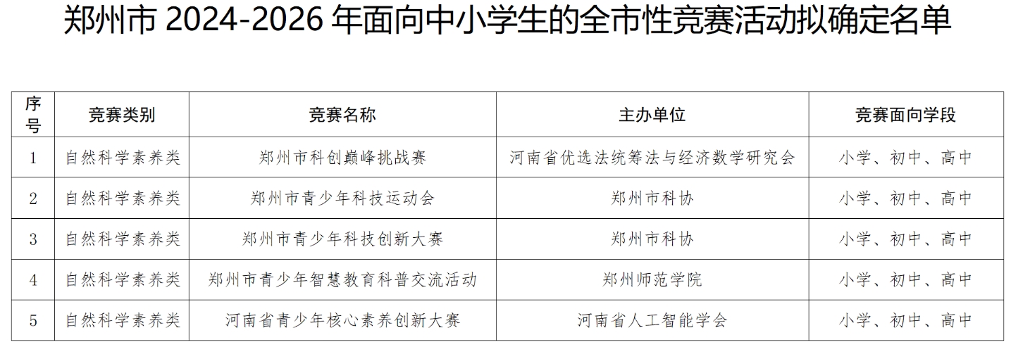 郑州市教育局关于2024-2026年面向中小学生的全市性竞赛活动拟确定名单和2024年全国性、全省性竞赛活动在我市备案拟通过名单的公示