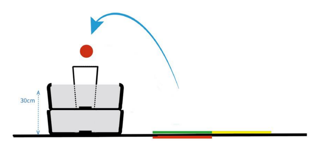 在这个篮球场地中,机器人需要向塑料杯子(篮子)内投掷一个乒乓球。篮子需要放在开放式盒子内(EV3 盒子、没有盖子),然后将这个盒子放在另一个带盖子的盒子的顶部,这样使篮框高于地面 15 cm。在场地上有三(3)个颜色区域,尺寸分别为 25 厘米×25 厘米。在投篮之前,机器人必须完全放置在颜色区域内。目标是让机器人投篮成功。如果你未能投入篮筐内,但是你的篮球仍然进入了敞开盖子的盒子里,你仍旧有得分的可能性。你的机器人从绿色方块开始投篮,在此期间,你的机器人必须完全在彩色区域内才能开始投篮。详情见图示。